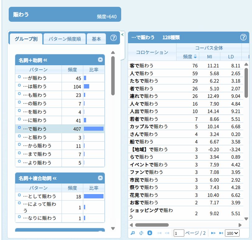 でも、「賑わわせる」は、日本語の用例として全く使われていないわけではなさそうです。国立国語研究所によるコーパス検索ツール『NINJAL-LWP for BCCWJ』(以下、NLBと記します。NLBは会員登録をせずに使える無料のツールです)で、「賑わう」「賑わす」を検索してみました。